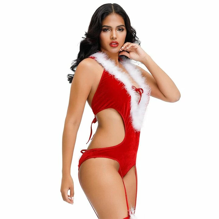 This red velour body stars a fluffy white trim, flaunting your cleavage with a plunging neckline that ties enticingly at the bust. Side cut-outs flaunt your curves for a sexy slimming effect while white pom-poms draw all attention to the backless cut-out across your bottom. Simply attach some sexy stockings to the adjustable suspender straps to finish your festive look!
