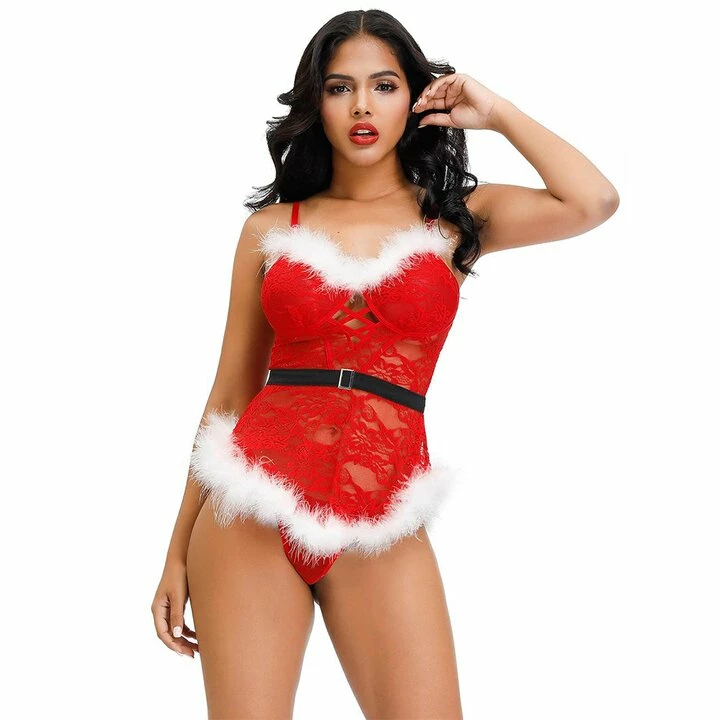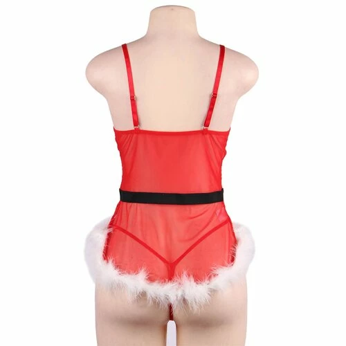 This ravishing red babydoll guarantees a very merry XXXmas with fluffy white trim and matching G-string to finish your festive look.