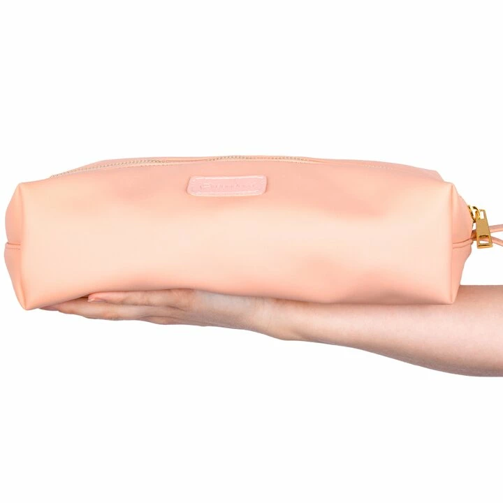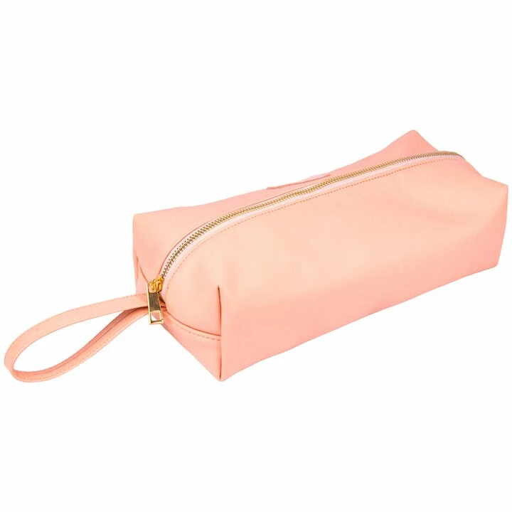 โข Soft pink PU leather pouch has a stylish gold zipper and protective fabric lining