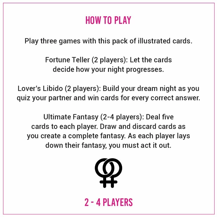 Experiment with some new and exciting sex positions with this Lesbian Sex Card Game. Each card has a different naughty position or idea for you and your lover to try. Learn more about your partnerβs desires and spend the night discovering more about yourself too! This game can be played three different ways ; let fate decide your adventure, learn about your lover with the Loverβs Libido or add a third or fourth player with the Ultimate Fantasy Card.