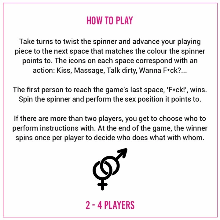 β’ Race to the βF*ck!β finishing square and spin to reveal your kinky sex position