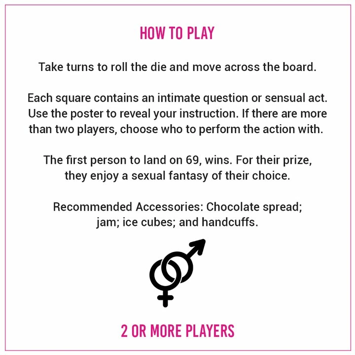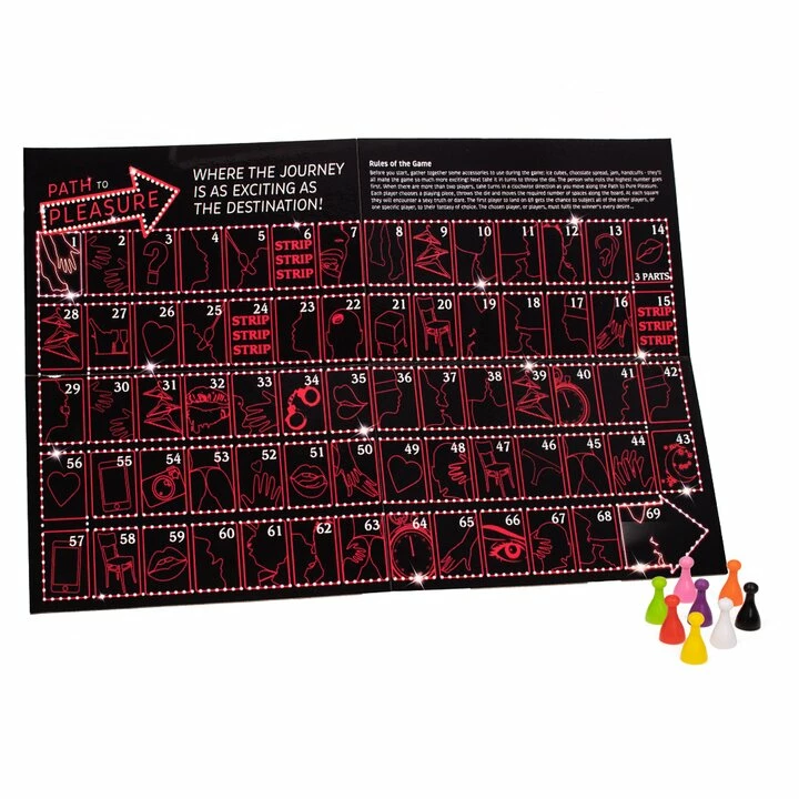 Embark on a sexual journey and explore your deepest desires with the Path to Pleasure Board Game. Behind each square on the board you will discover an intimate question or sexual prompt that requires instant action. Progress at ease through three stages of increasingly sensual and exciting challenges as you advance down the path to pleasure. When the winning player arrives at square 69 they have the pleasure of receiving a naughty prize!