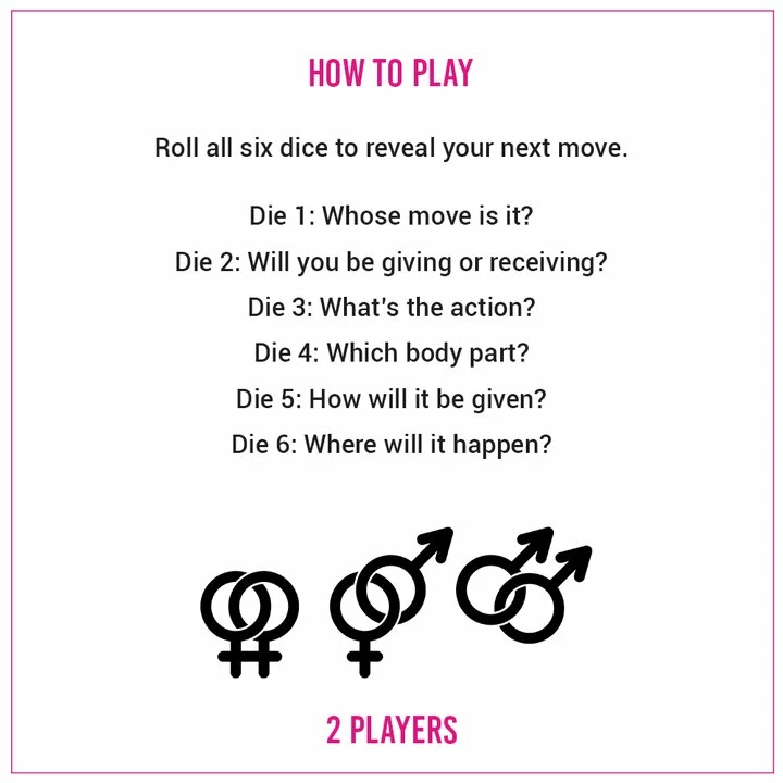 If you fancy nibbling nipples slowly in the bathroom or having your bottom pleasured wickedly in the kitchen, then the Sexy 6 Dice โ Foreplay Edition is definitely for you. With 720 sensual foreplay opportunities stemming from the throw of a dice, you and your eager playmate will have many naughty nights to remember. The initial dice determines whether it is โmeโ, โyouโ or โbothโ who gives or receives the ensuing commands. What is a Wednesday night without the chance to suck your partnerโs sexy bits roughly in the living room or outside? Place your pleasure in the hands of the Sexy 6 daring dice and inspire incredible foreplay fantasies.as you open your mind to the realistic possibility of opening your orifices.